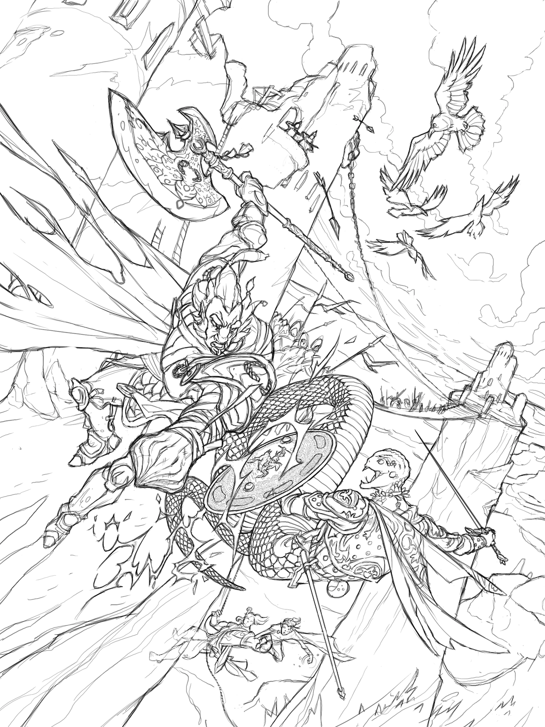 In planning this painting, I knew I had to do justice to all the character and environment details that my client had meticulously crafted with their D&D group. I also wanted to convey the high stakes and intense tone, while adding some levity and hope with the birds flying high. Time to make some thumbnails.