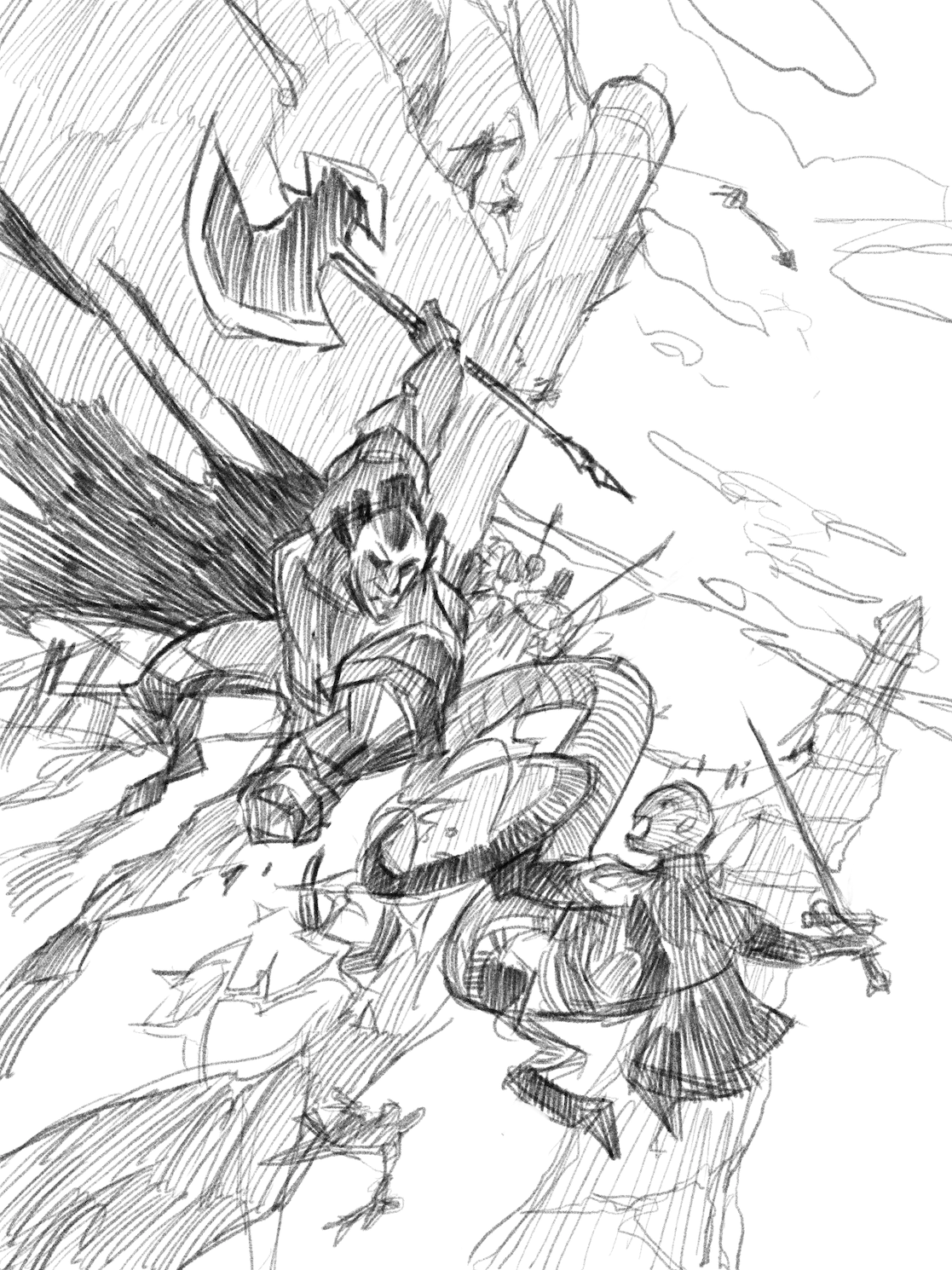 I started by creating 3 quick thumbnail sketches in Procreate to show the client. I chose a few character orientations and camera angles. In all of them, I wanted a strong diagonal composition to throw the viewer off balance and introduce a sense of peril. We ended up choosing the middle one.