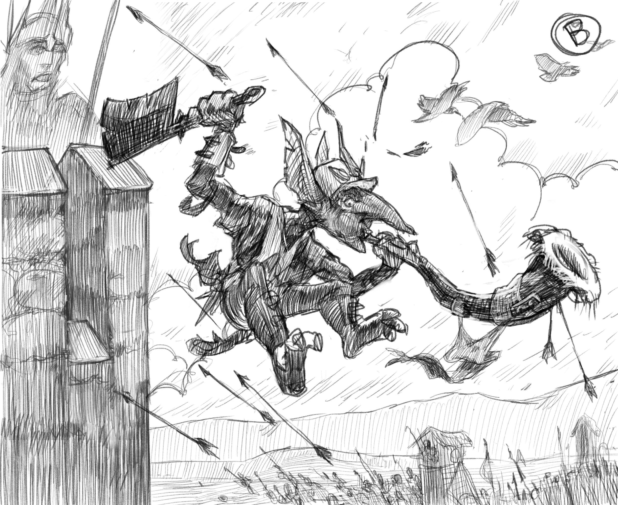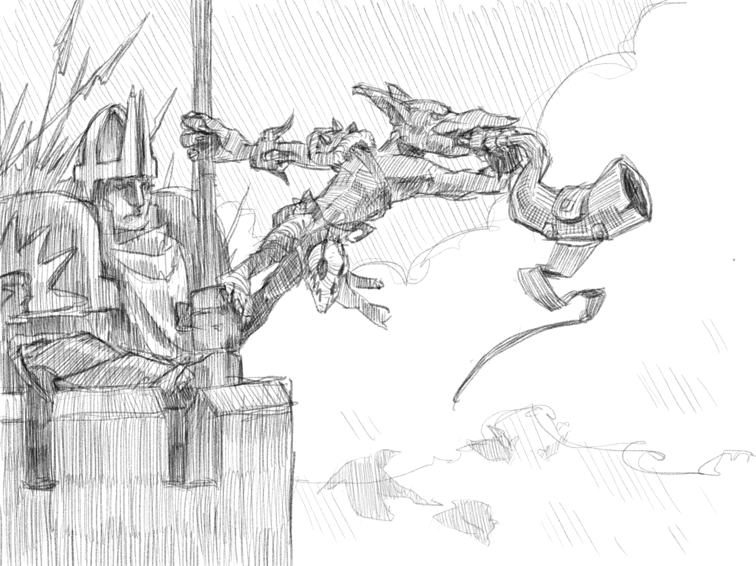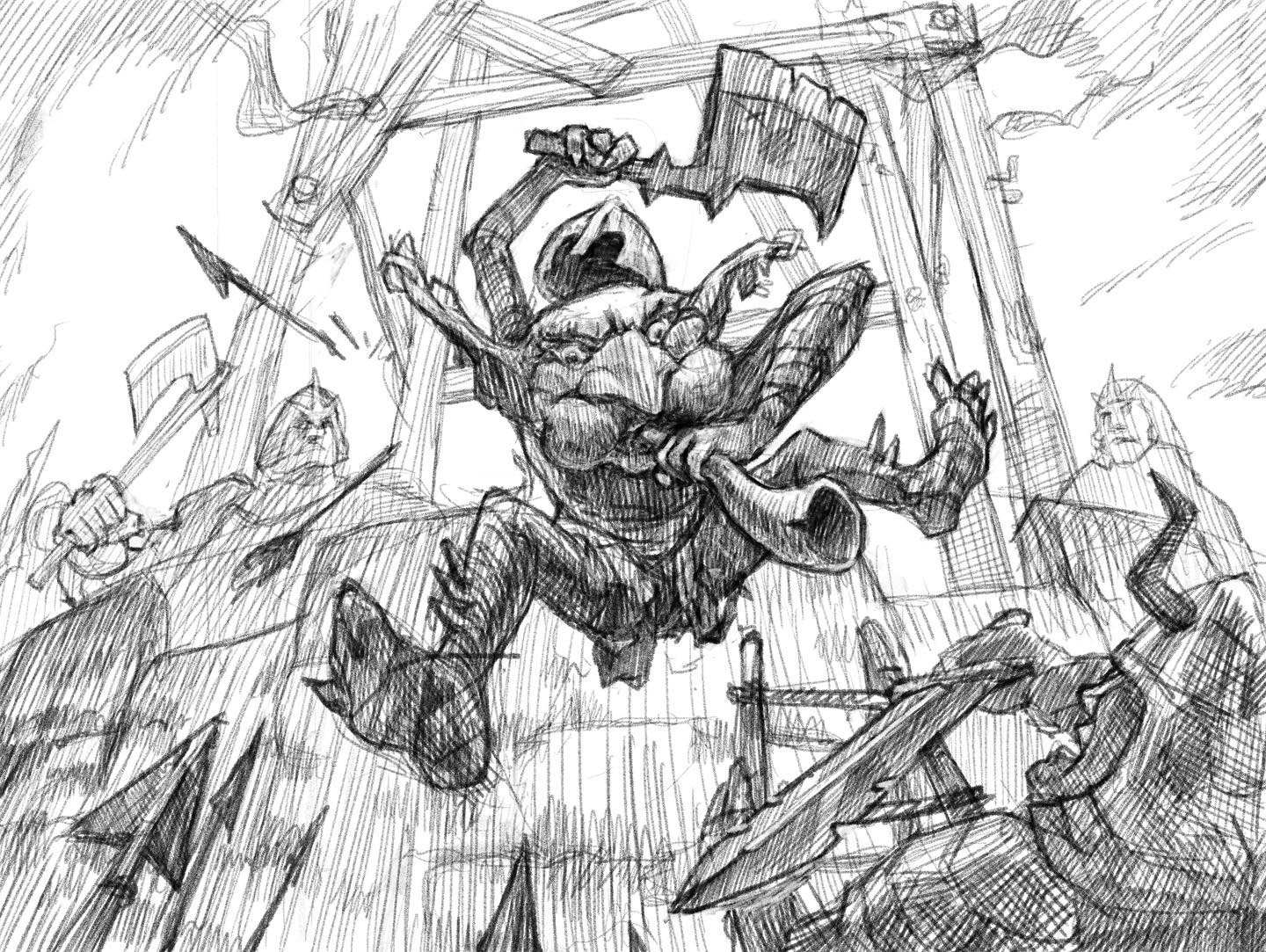 After I’d finished both of those sketches, the composition was still feeling too static and stiff for the subject matter. So I drafted a third line drawing with some extra action: now tha goblin was jumping off the parapet and swinging a cleaver.