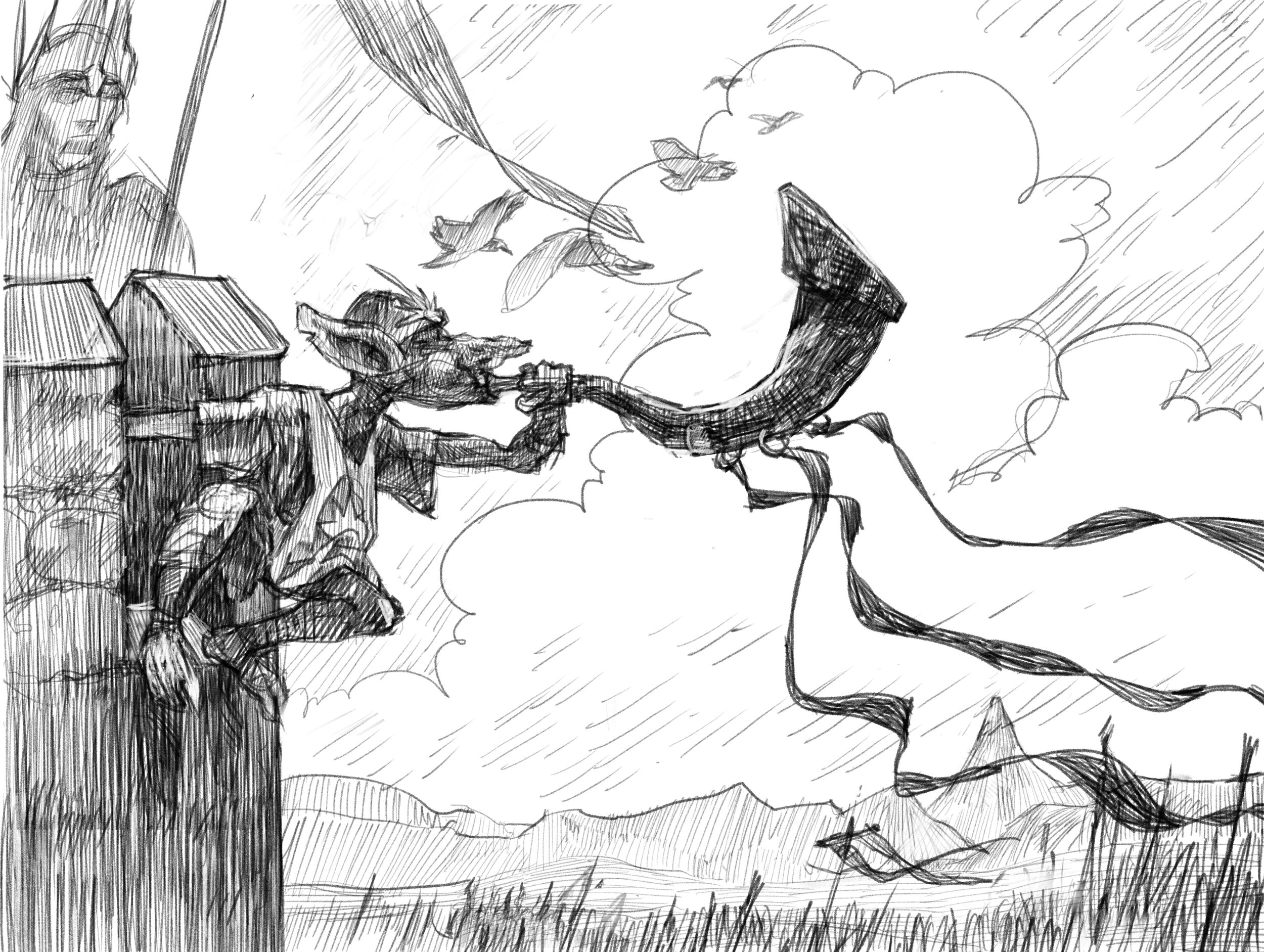 I still wasn’t happy with it though. So I redrew it as a dramatic perspective shot of the goblin jumping down from the parapet and blowing his horn. I ended up bringing that one to final.