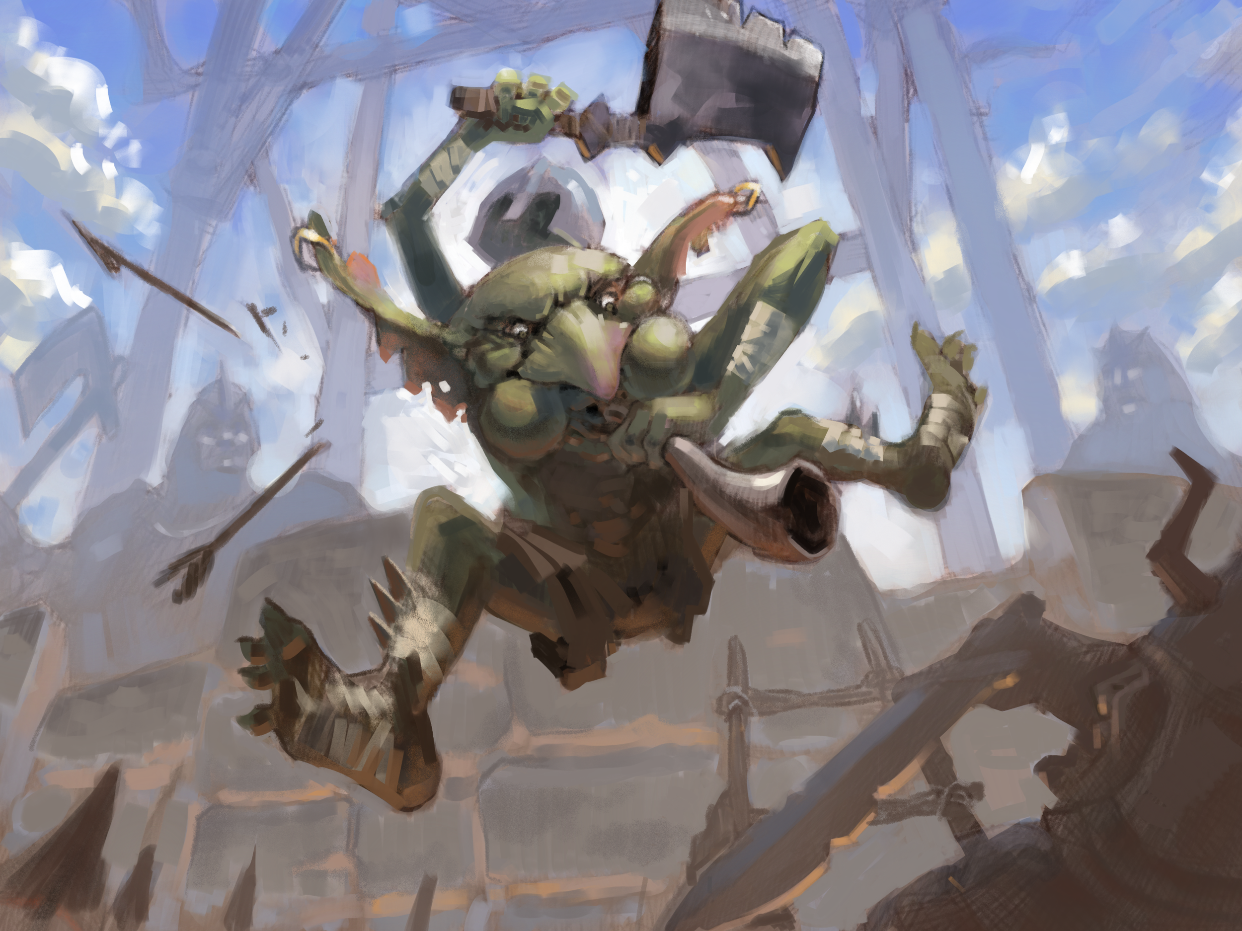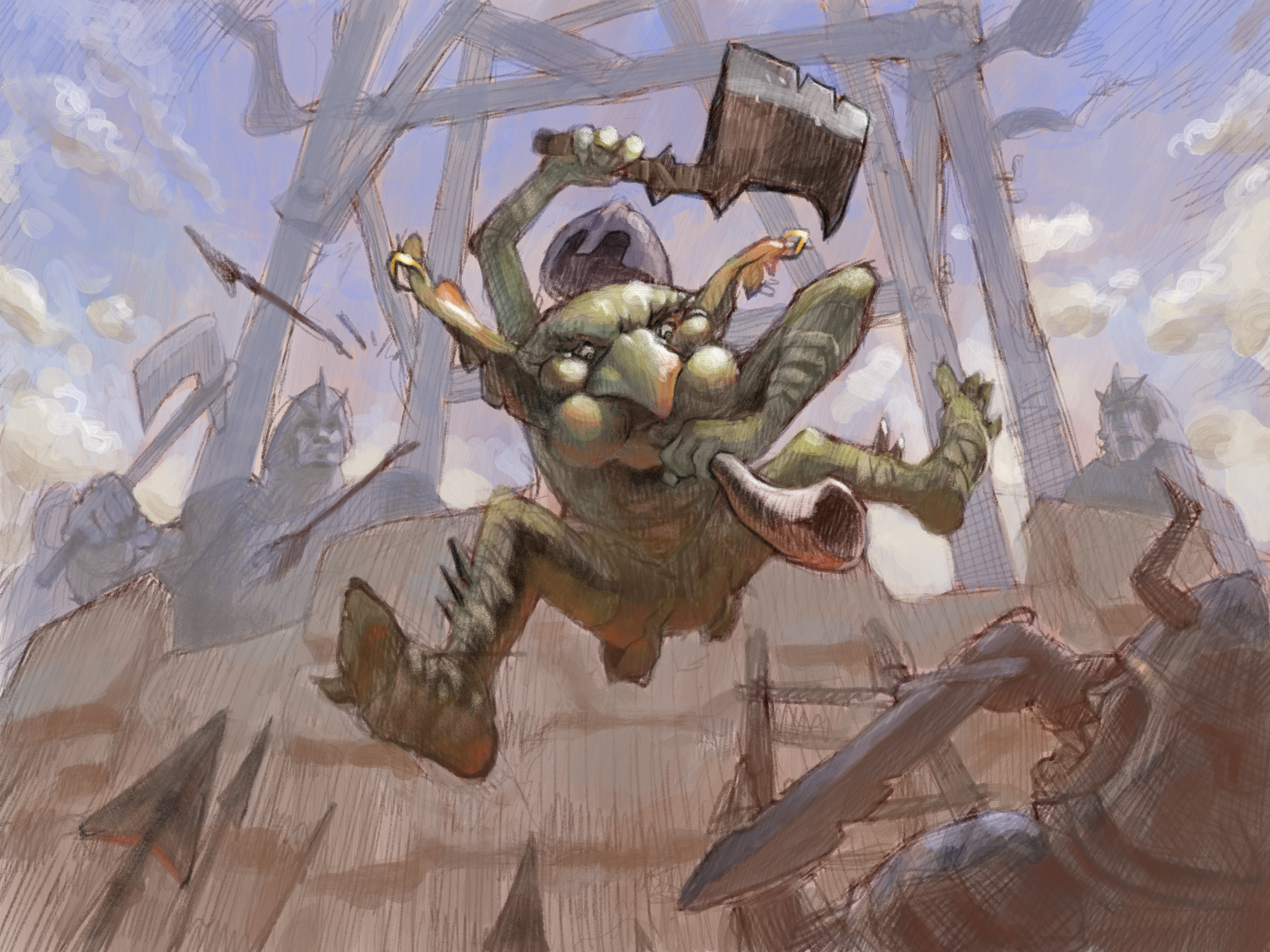 I started tentatively building up color over the line drawing, letting certain elements of the linework show through. Ultimately, I ended up going in more boldly and covering up all the linework in favor of a smoother, painterly texture. At some point, I also removed the scaffolding behind the goblin, and swapped his helmet for an expressive hairstyle.