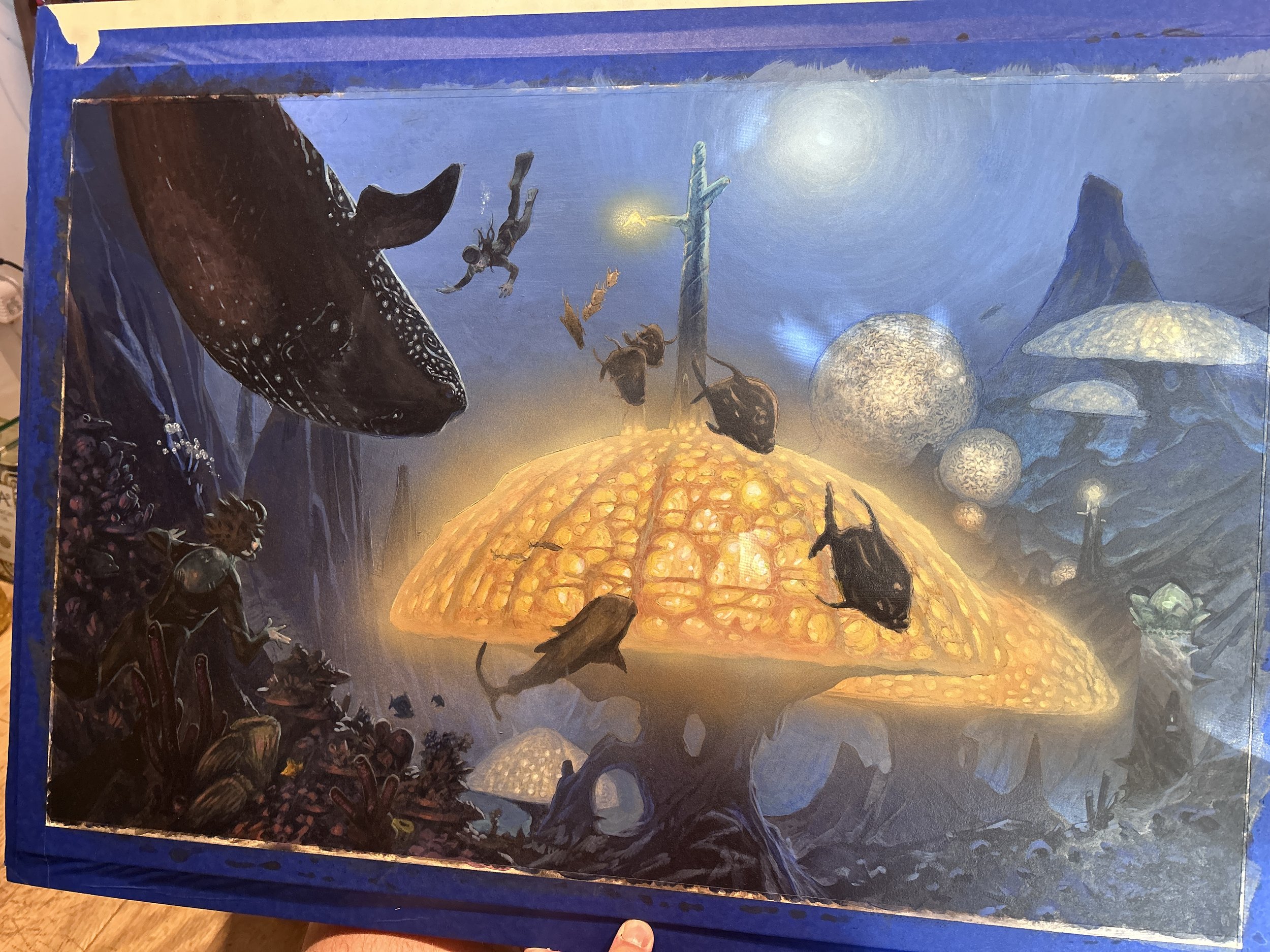 Once the monochrome ground was established, I painted the whole thing in acrylic, moving from the background to the foreground, using an airbrushing of gouache to achieve the glow effect on the structures.