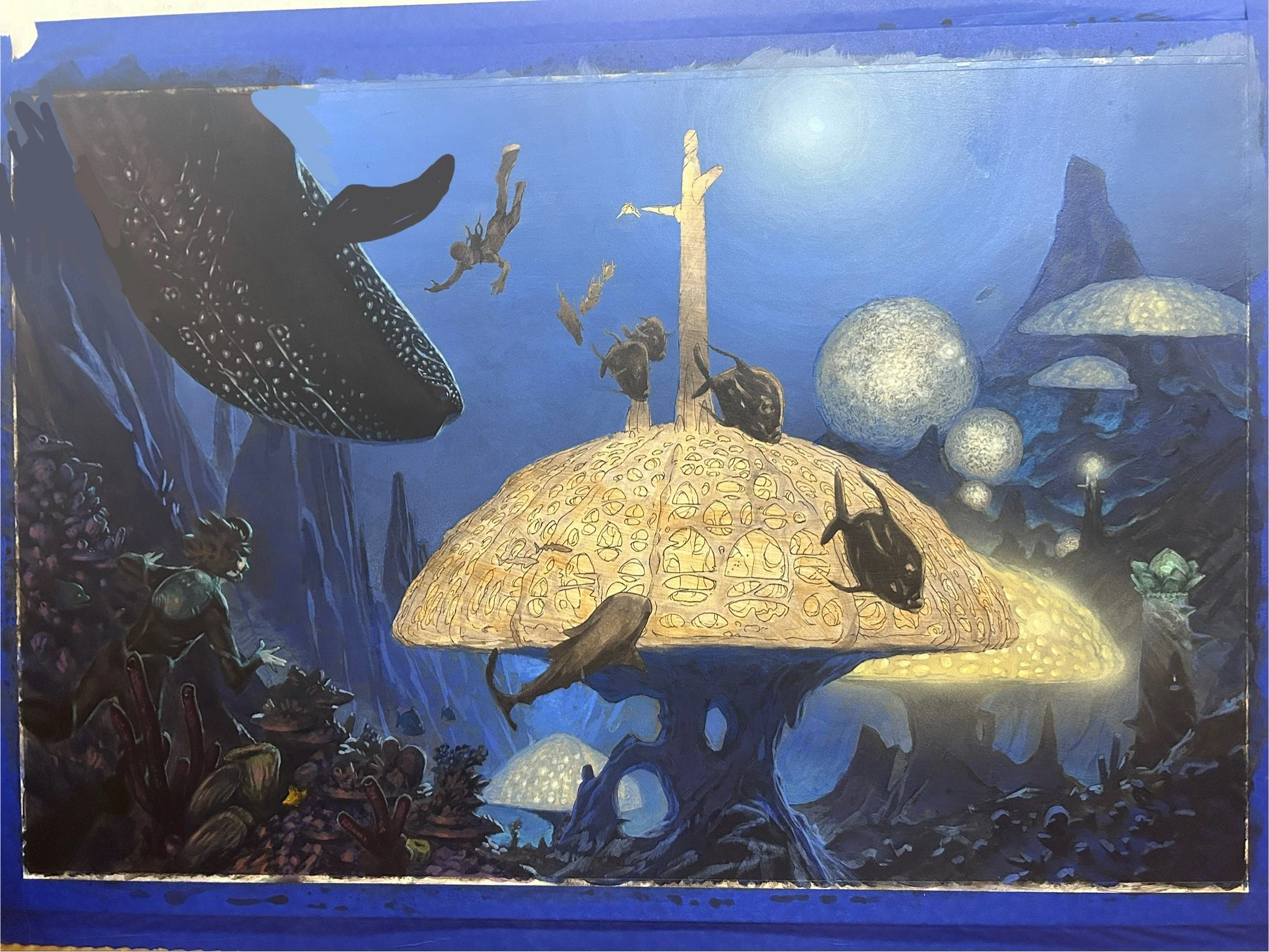 The buildings had to look futuristic, yet organic, somewhat biomechanical. I wanted to evoke a sense of wonder and awe, as well as abundance of life with fish and coral and a couple divers.